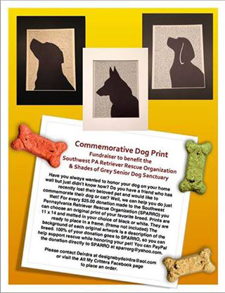 Have you always wanted to honor your dog on your home wall but just didn't know how? Do you have a friend who has recently lost their beloved pet and would like to commemorate their dog or cat? Well, we can help you do just that! For every $25.00 donation made to the Southwest Pennsylvania Retriever Rescue Organization (SPARRO) you can choose an original print of your favorite breed. Prints are 11 x 14 and matted in your choice of black or white. They are ready to place in a frame. (frame not included) The background of each original artwork is a description of the breed. 100% of your donation goes to SPARRO, so you can help support rescue while honoring your pet! You can PayPal the donation directly to SPARRO at sparrorg@yahoo.com.